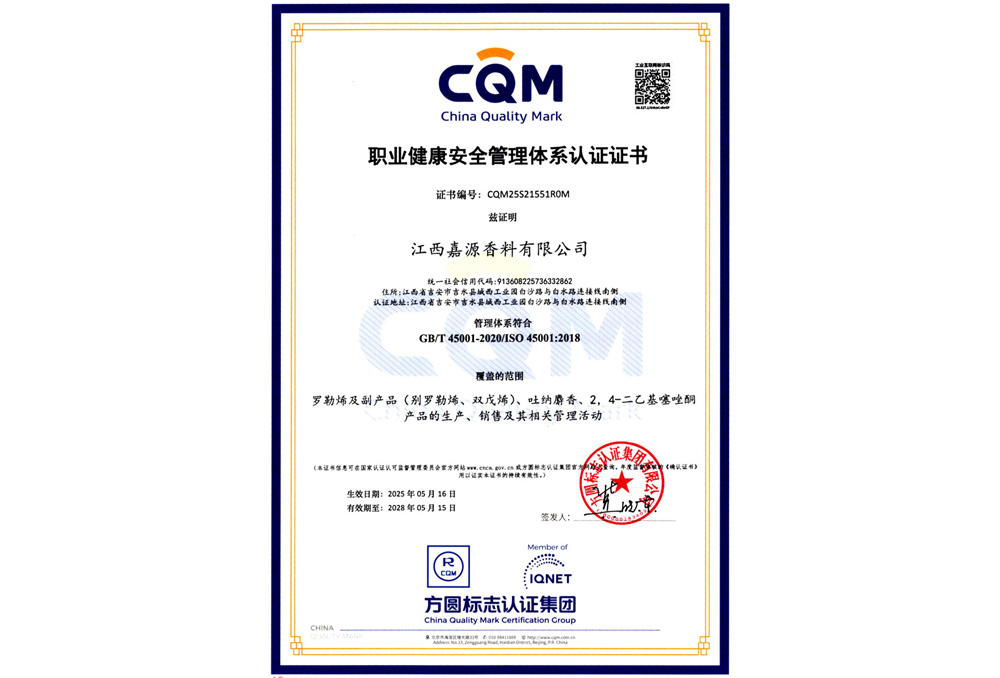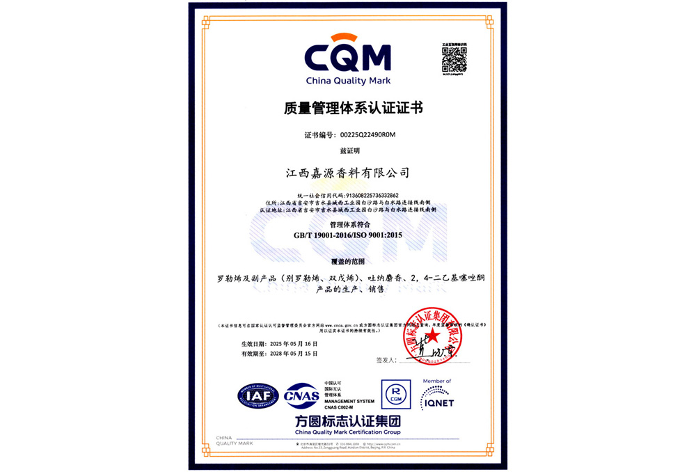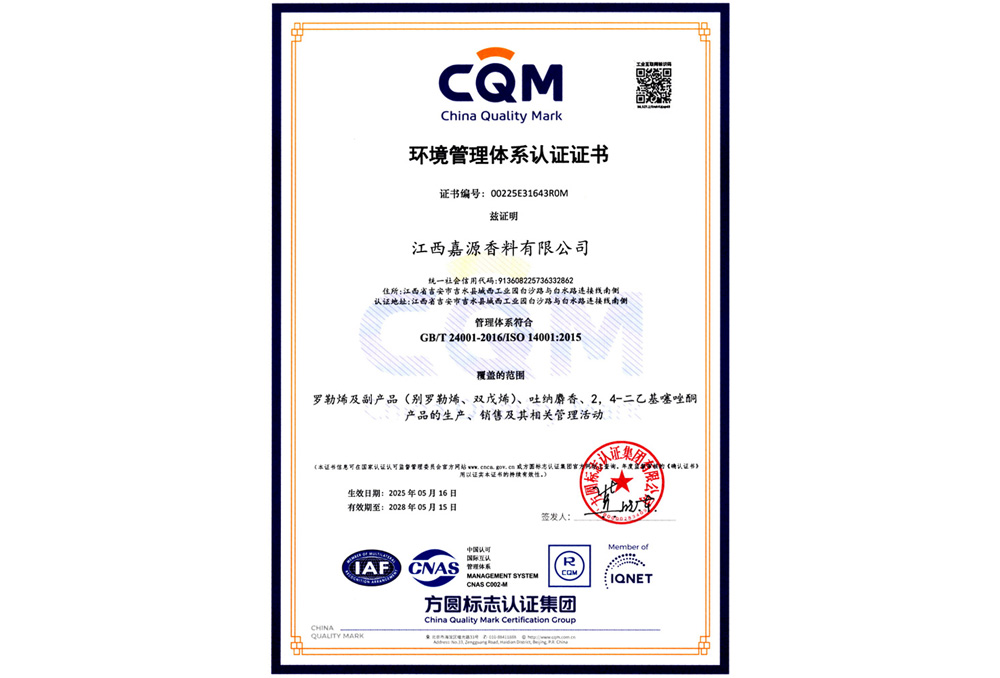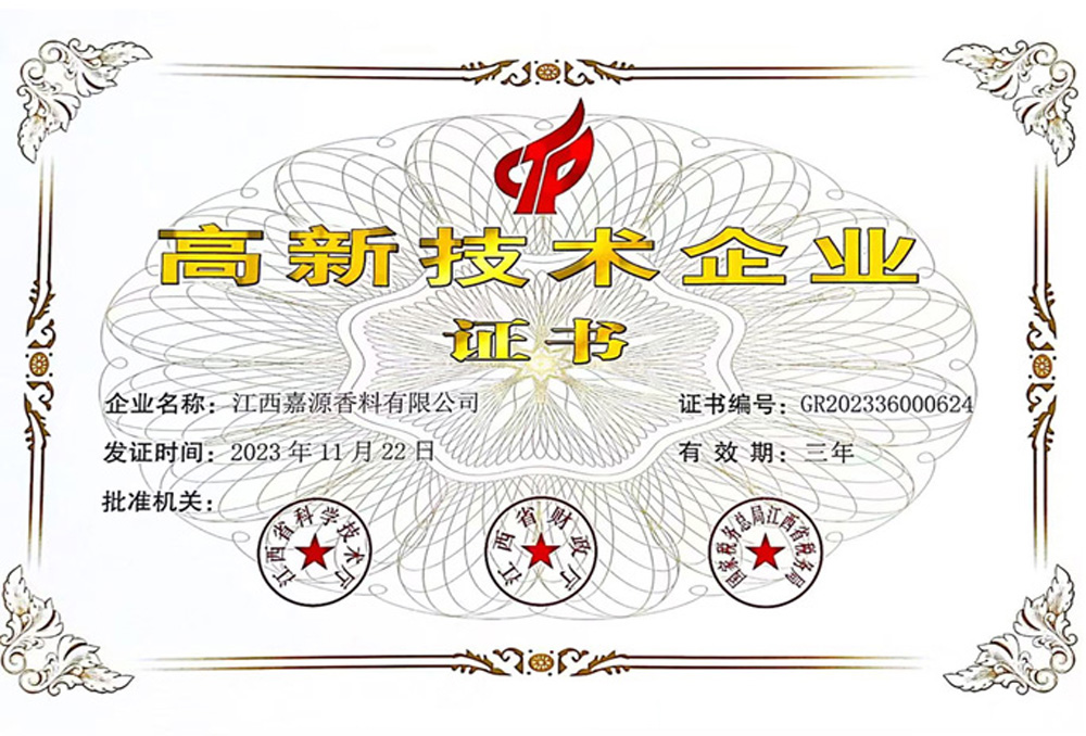 江西嘉源香料有限公司成立于2011年,位于江西省吉安市吉水县城西工业园,是一家集专业香料原料和光引发剂生产、研发、销售为一体的综合型企业;公司注册资金1000万元人民币,总占地面积29200平方米。